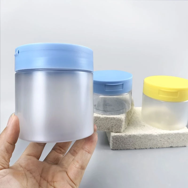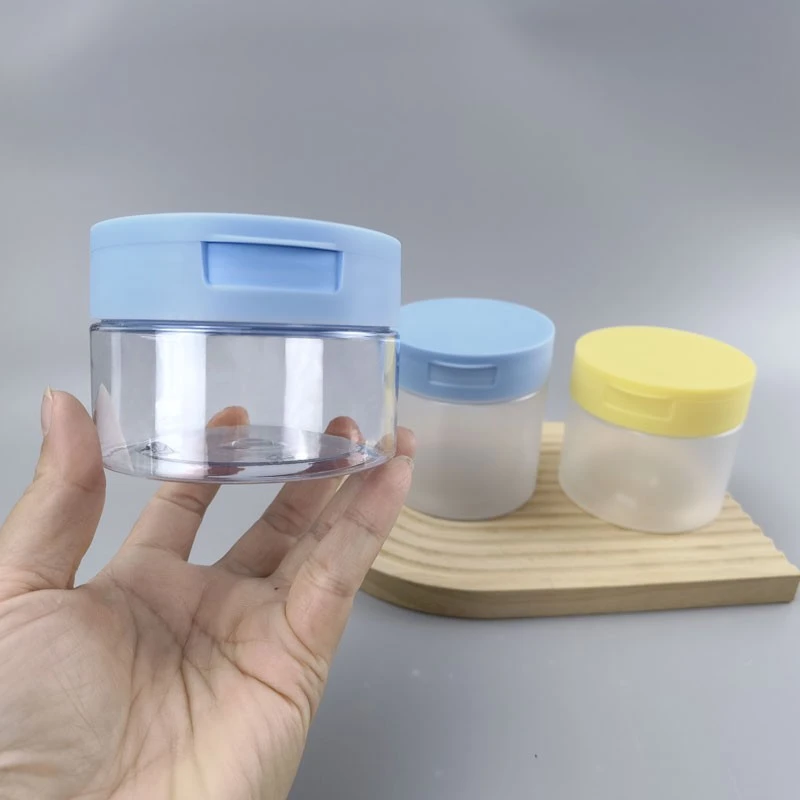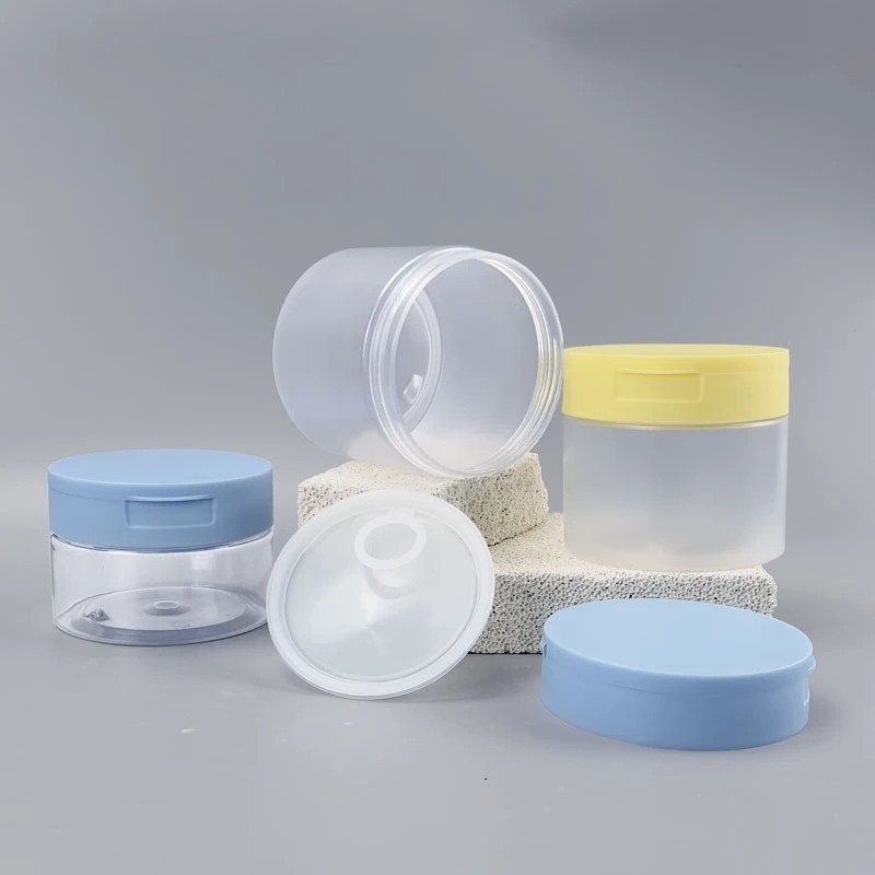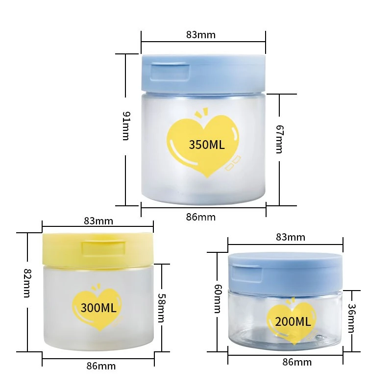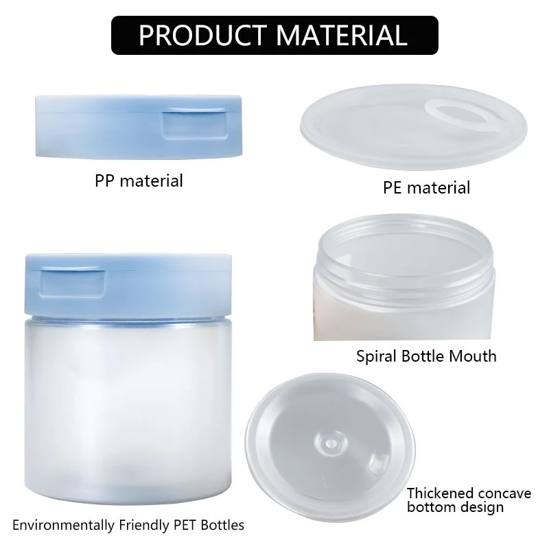 ZH-250908--200ml-350mlPET plastic cosmetic jar. This jar is used to store facial masks, face creams, body lotions, skin care pastes, etc. PET cans have clear visibility. Some customers also prefer to apply surface treatments such as frosting. The frosted appearance makes the cans look more upscale and can enhance the brand's luxury level. Each lid comes with a plastic tweezers. These accessories make it easy to use items like makeup remover pads or cotton pads, enhancing the user experience.